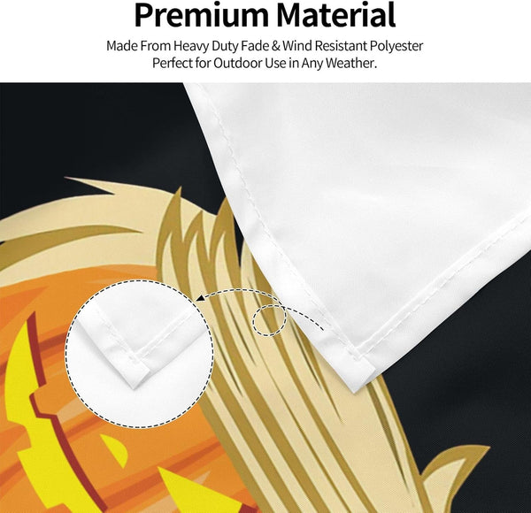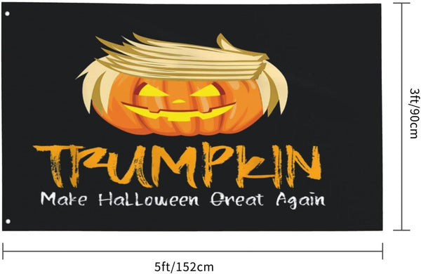 Show your spooky spirit and patriotic pride with the hilarious Trumpkin Flag! Featuring President Trump’s iconic hairstyle on a glowing jack-o’-lantern and the bold slogan “Make Halloween Great Again,” this 3x5-foot flag is the ultimate decoration for Trump fans and Halloween lovers alike.