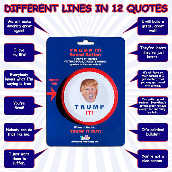 The ultimate gift for anyone with a sense of humor and a passion for politics! With just a press, hear 12 of President Trump's most iconic quotes in his voice, making it a hilarious addition to any office, desk, or home.Â